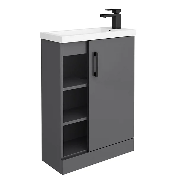 Apollo2 605mm Compact Open Shelf Floor Standing Vanity Unit (Gloss Grey – Depth 260mm) w. Matt Black Handle