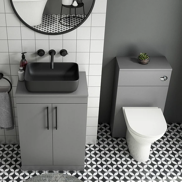 The contemporary matt grey Arezzo furniture package, with it’s clean lines this suite is perfect for renewing the style in any bathroom. The vanity unit’s stylish modern design hides all unsightly pipework creating a neat modern look. Internal shelves provide generous storage space for your toiletries, helping to keep your bathroom clutter free. Features eye-catching and stylish matt grey finish with a on-trend contrasting modern matt black counter top basin and square bar handles. WC unit comes supplied with a dual flush concealed WC cistern and modern toilet with soft closing seat.