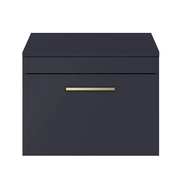 Arezzo 600 Matt Blue Wall Hung Vanity Unit with Worktop + Brushed Brass Handle (Excludes Basin)