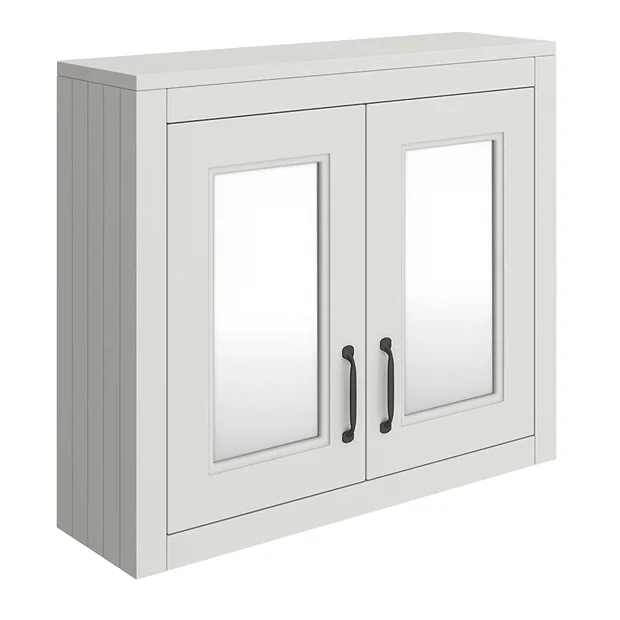 Embrace a traditional interior style in your bathroom with the Chatsworth Grey Two Door Mirror Cabinet. The tongue and groove side panelling and chic satin grey create a countryside elegance. It features classic handles with a matt black finish. More than just a design feature – the Chatsworth bathroom cabinet has plenty of space for your cosmetics and soft closing doors for a peaceful environment. Pair your wall hung bathroom mirror cabinet with the Chatsworth Traditional Grey Vanity for a matching look in your bathroom.