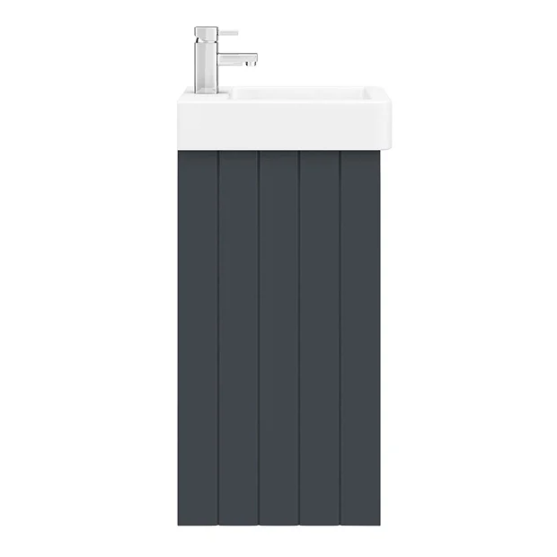 The Chatsworth traditional 425mm wide satin graphite vanity unit with gloss white basin, Victorian inspired design with a modern twist. The Chatsworth range of charming bathroom furniture features classic styling with a satin graphite finish cabinet and tongue-and-groove side panelling.