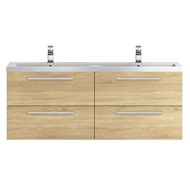 This Natural Oak textured wood effect double vanity unit with basins has four storage drawers, perfect for couples or families. The Quartet range from Hudson Reed contains a wide range of vanity units, including this large double vanity. The Natural Oak furniture range is ideal for subtly adding colour into your bathroom. Pair this striking double unit with a stylish back to wall toilet for a high-end designer look.