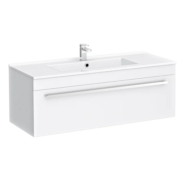 The Nova 1000 x 400mm high gloss white wall mounted unit with ceramic basin top and drop-down cupboard door, make the most of your bathroom with our practical and attractive furniture options. The high gloss white wall mounted unit is part of the new minimalist furniture range which will give a contemporary look to your bathroom. All high gloss white vanity units feature a high quality ceramic basin.
