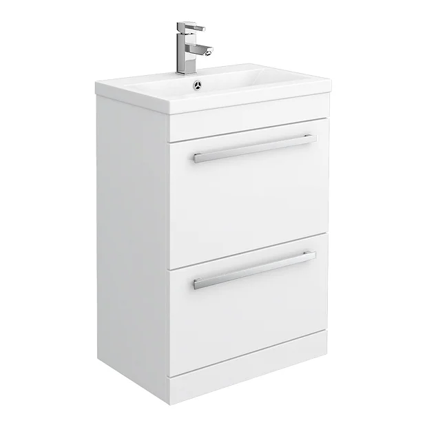 A minimalist 600mm floor standing vanity unit with quality stylish mid edge’ ceramic basin top, make the most of your bathroom with our practical and attractive modern white gloss furniture options.