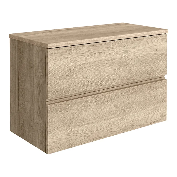 The Linea range from Venice brings a cool and contemporary look to any bathroom. This 800mm wall hung 2-drawer rustic oak effect vanity unit with worktop provides ample storage for all your bathroom toiletries and cleaning supplies.
