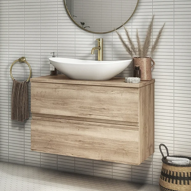 Venice Linea 800mm Rustic Oak Effect Vanity Unit – Wall Hung 2 Drawer Unit with Worktop and Matt White 620mm Oval Counter Top Basin